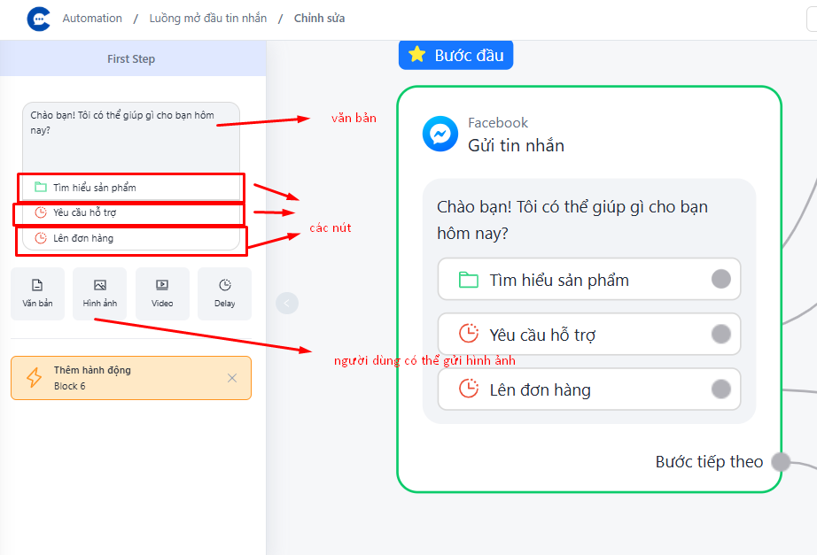 Người dùng có thể thiết lập gửi các tin nhắn mà bản thân người dùng mong muốn. Tại đây, người dùng có thể tạo các tin nhắn để gửi cho khách hàng và các câu trả lời cho khách hàng chọn. Mỗi button người dùng tạo sẽ phải được gán với một hành động phía sau